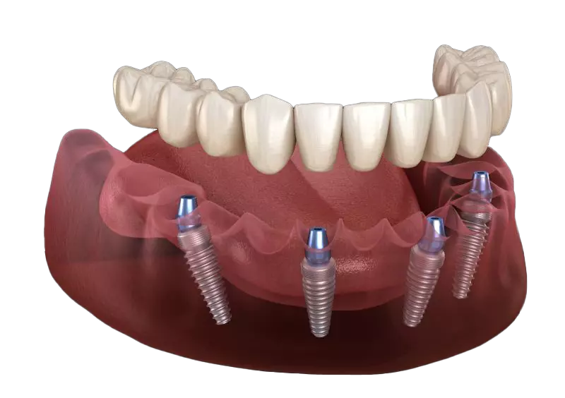 A set of implants on either the top, bottom or both arches are strategically placed as a support for a fixed denture to give you a new and permanent smile.